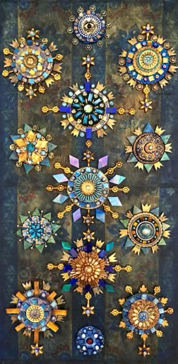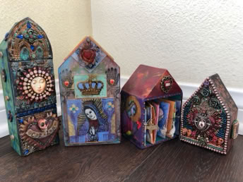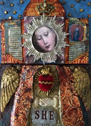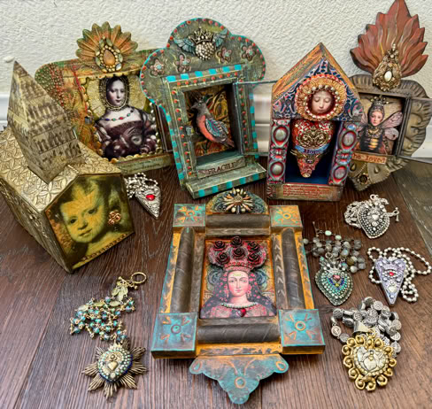 Polymer clay—still a young material within the landscape of contemporary art—has served as a powerful vehicle for invention. Early in my career, I focused on creating handmade polymer clay tiles, exploring mosaic and assemblage techniques that combined the tactile qualities of clay with materials rich in history, symbolism, and meaning. These mixed-media mosaics became the foundation of my practice and the work for which I was initially best known, culminating in the 2007 publication of my book, Mixed Media Mosaics. Over time, this process matured into a highly personal visual language—one that weaves ornament, texture, and narrative fragments into cohesive, story-driven compositions. In this early body of work, inspired by Medieval, Renaissance and Mexican folk art, the gilded devotional panels of the past became secular icons imbued with personal narratives. Sumptuously embellished surfaces, often incorporating text, merged traditional and contemporary materials. Like a modern-day alchemist tinkering with the art of the ancients, I found magic in combining these disparate elements.