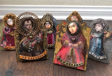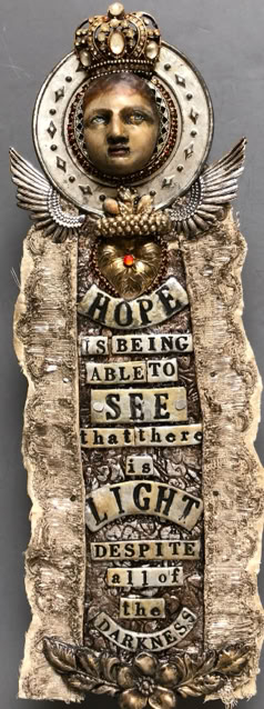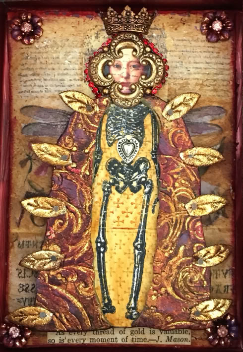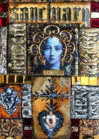 Polymer clay—still a young material within the landscape of contemporary art—has served as a powerful vehicle for invention. Early in my career, I focused on creating handmade polymer clay tiles, exploring mosaic and assemblage techniques that combined the tactile qualities of clay with materials rich in history, symbolism, and meaning. These mixed-media mosaics became the foundation of my practice and the work for which I was initially best known, culminating in the 2007 publication of my book, Mixed Media Mosaics. Over time, this process matured into a highly personal visual language—one that weaves ornament, texture, and narrative fragments into cohesive, story-driven compositions. In this early body of work, inspired by Medieval, Renaissance and Mexican folk art, the gilded devotional panels of the past became secular icons imbued with personal narratives. Sumptuously embellished surfaces, often incorporating text, merged traditional and contemporary materials. Like a modern-day alchemist tinkering with the art of the ancients, I found magic in combining these disparate elements.